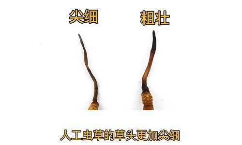 第一,人工蟲草的草頭更加纖細。